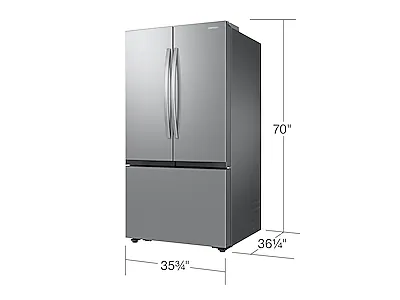 Samsung Mega Capacity 3-Door French Door refrigerator features 32 cu. ft. capacity, Dual Auto Ice Maker and a modern design. Store more groceries, including big and bulky items. The Dual Auto Ice Maker makes two types of ice – cubed, or Ice Bites™ that chill your drink faster