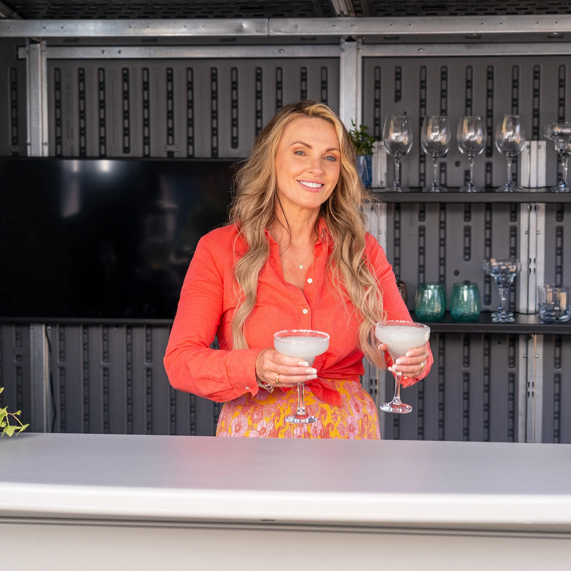 Adjustable Shelving: Interior countertop serves as a prep area and includes adjustable shelving for organization.