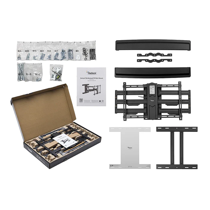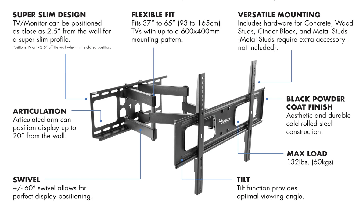 The Starburst SB-3790ART-FM (FLUID MOTION) FULL MOTION TV WALL MOUNT fits most flat panel & curved TVs 37 to 90" up to 132 pounds. This new contemporary design, made with reinforced steel and specially designed copper washer joints, offers a wide range of EASY FLUID MOTION. Dual articulating arms allow you to tilt, swivel and extend your TV to ensure the optimal viewing angle no matter where you are in the room. Finger Touch tilting technology allows effortless tilt with just a touch of a finger. Other Special features include Detachable VESA & Wall Plate for quick easy assembly, LATERAL SHIFT for off center studs, Toolless Tilt & lock adjustment knob, post install level and shift adjustments, cable management and 31.5" max extension which allows a true 90-degree swivel range. Includes a 5-year limited warrant